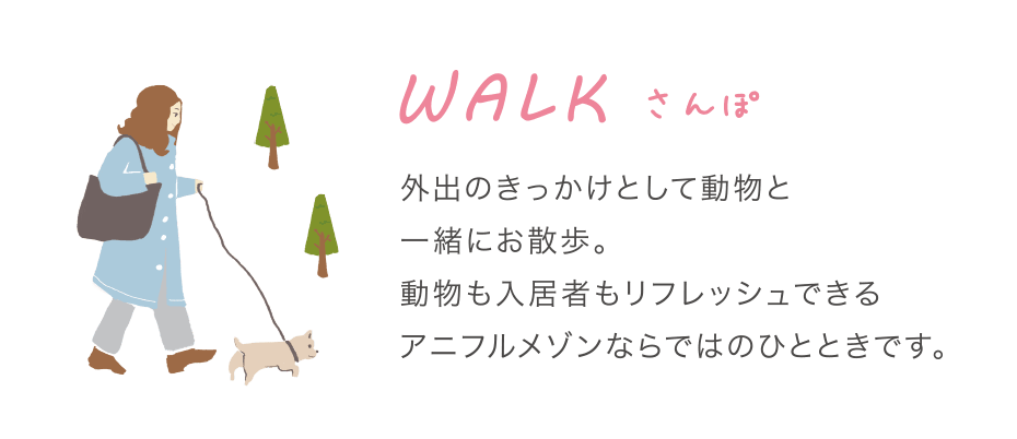 動物との共同生活を通じ、心のコンディションづくり、地域の方とのコミュニケーションづくりの一助になるよう、日々に寄り添いながら。